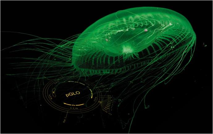 A jellyfish called Aequorea victoria, is what produces the green fluorescent protein. GFP is made out of 238 amino acids and is a very stable protein. The bioluminescent protein (aequorin), found in the jellyfish emits blue light which which is then converted to green light by the green fluorescent protein. This is why the jellyfish glows a fluorescent green. The protein absorbs ultraviolet light from the sunlight, and then emits it at a lower-energy green light. The blue light absorbance is 395nm while the green light is 508nm. The glow comes from a covalently-attached chromophore the intermolecular reaction that happens in the residues ser-tyr-gly. This chromophore is buried deep within the beta barrel, interrupting the helix and keeping it from interacting with the solvent. This fact is what makes GFP so stable. The beta barrel contains 6 alpha helices and 11 beta strands, connected by loops. The loops form a cylinder of beta sheet with anti-parallel strands (also known as the beta barrel).