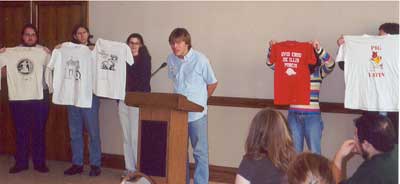 Beta Pi's Aaron Randolph (center) explains the various T-shirts entered in the attire contest by his chapter. |