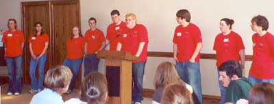 The T-shirt voted the best was from Monmouth College's Gamma Omicron; here it is worn by the delegates, with Mike Fanucce (center) introducing it. |